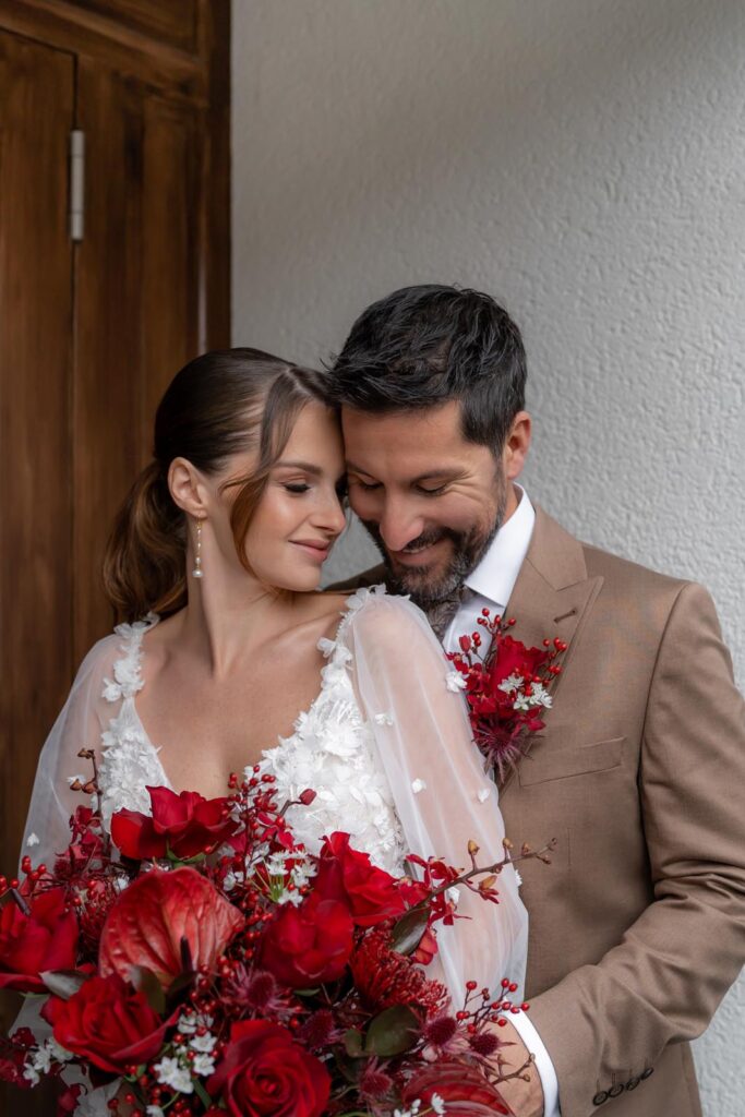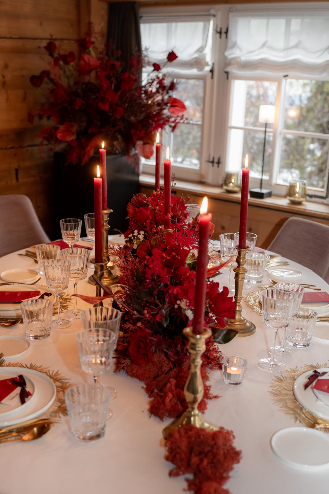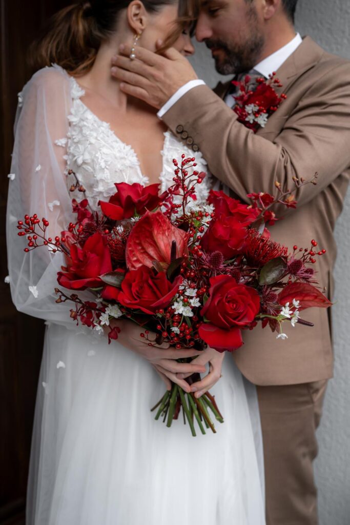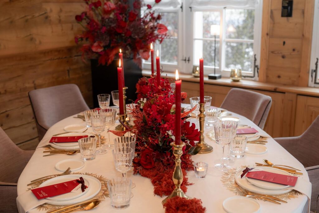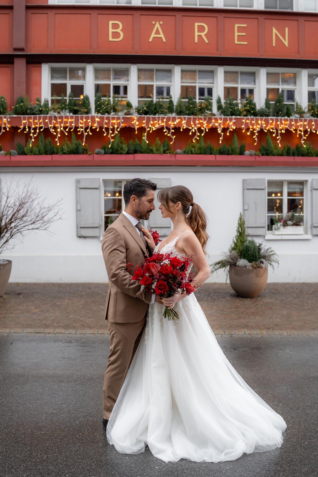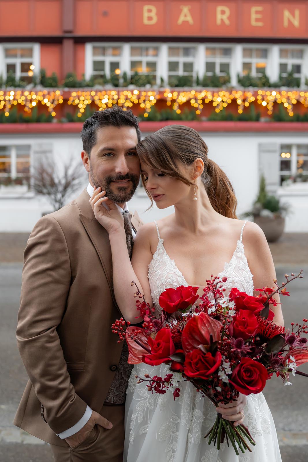 Ein wunderschönes Hochzeitsshooting in der weihnachtlichen Atmosphäre des Appenzeller Huus – Rot- und Goldtöne, Kerzenschein, Lichterketten – ein Hochzeitstraum inmitten einer verschneiten, winterlichen Atmosphäre.