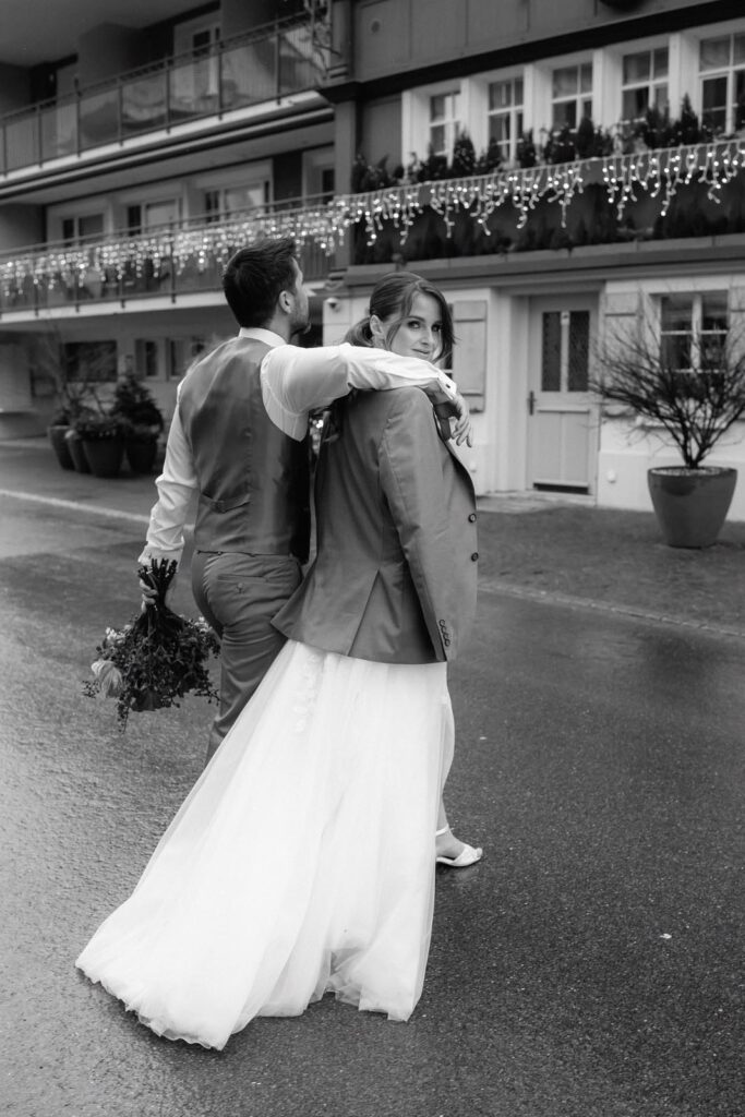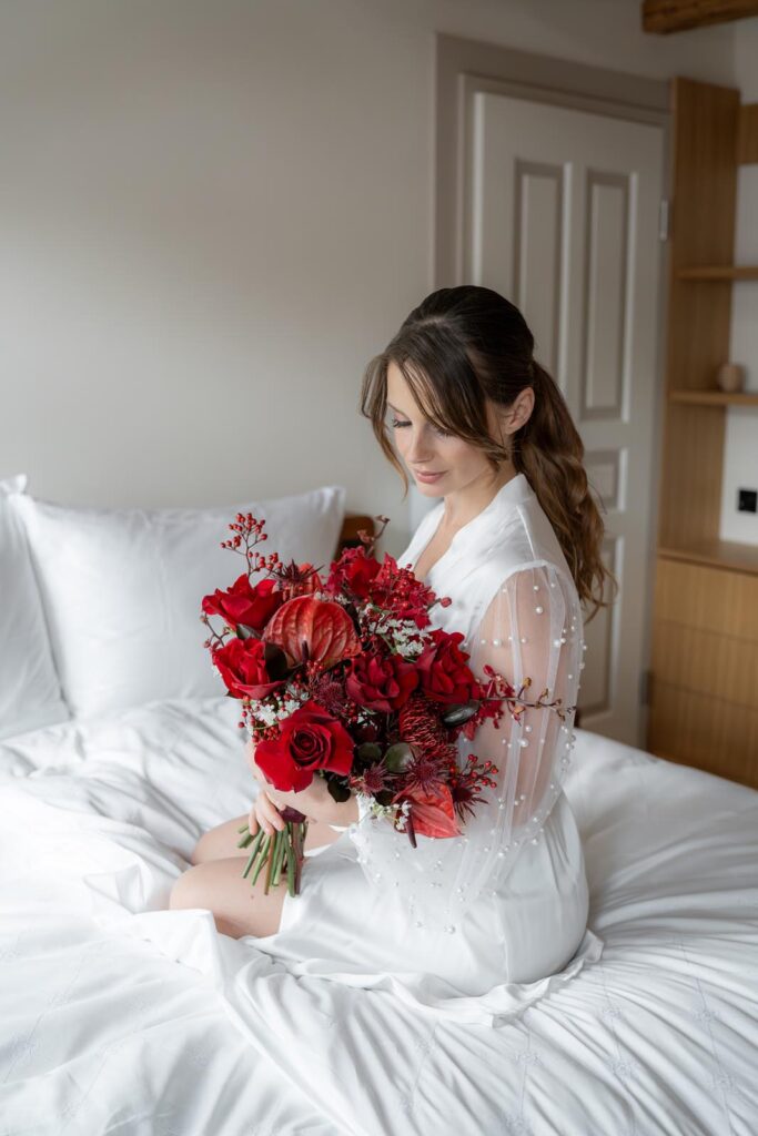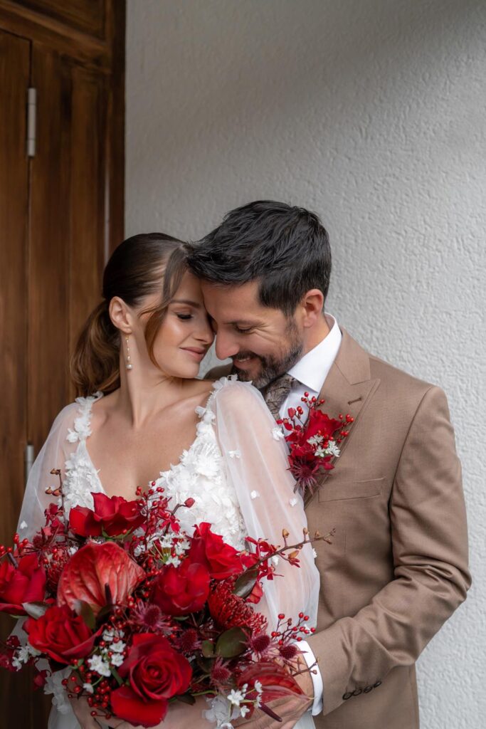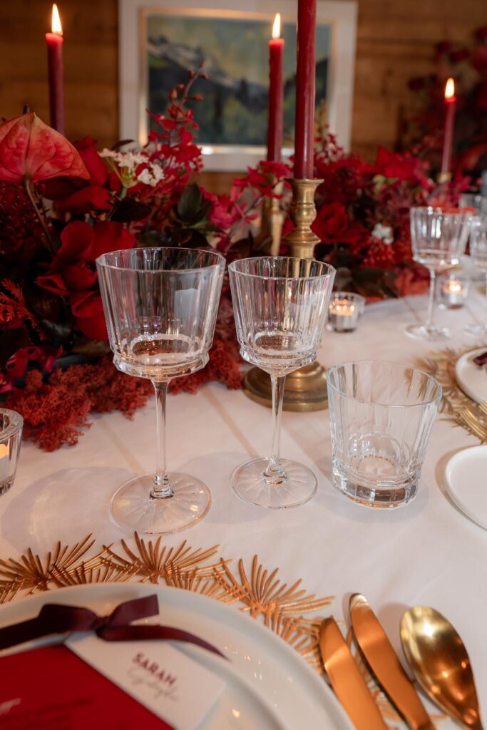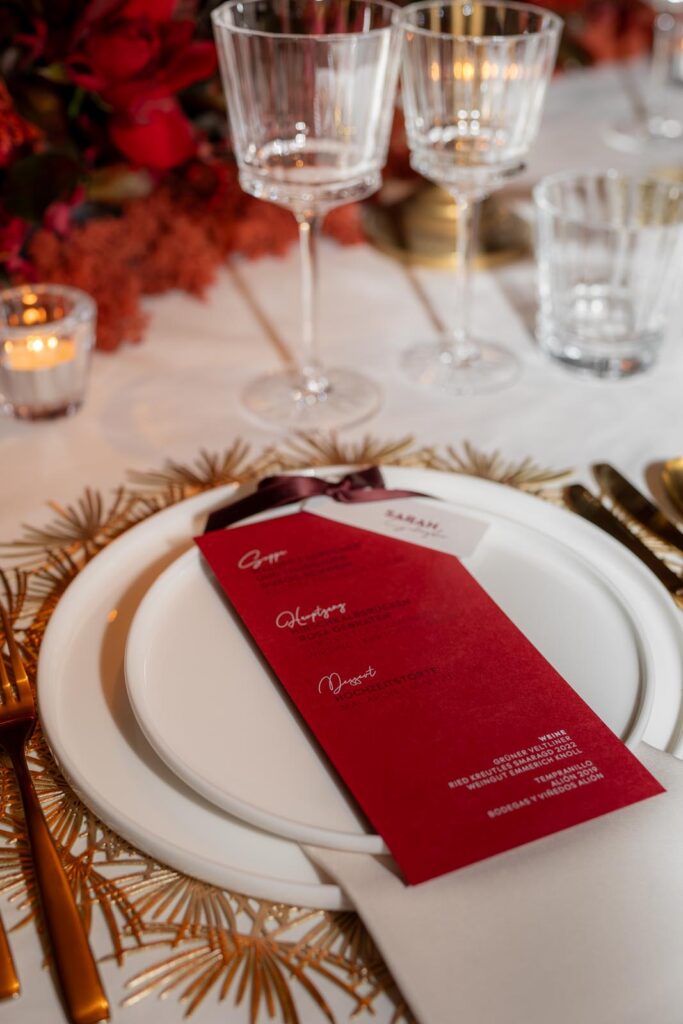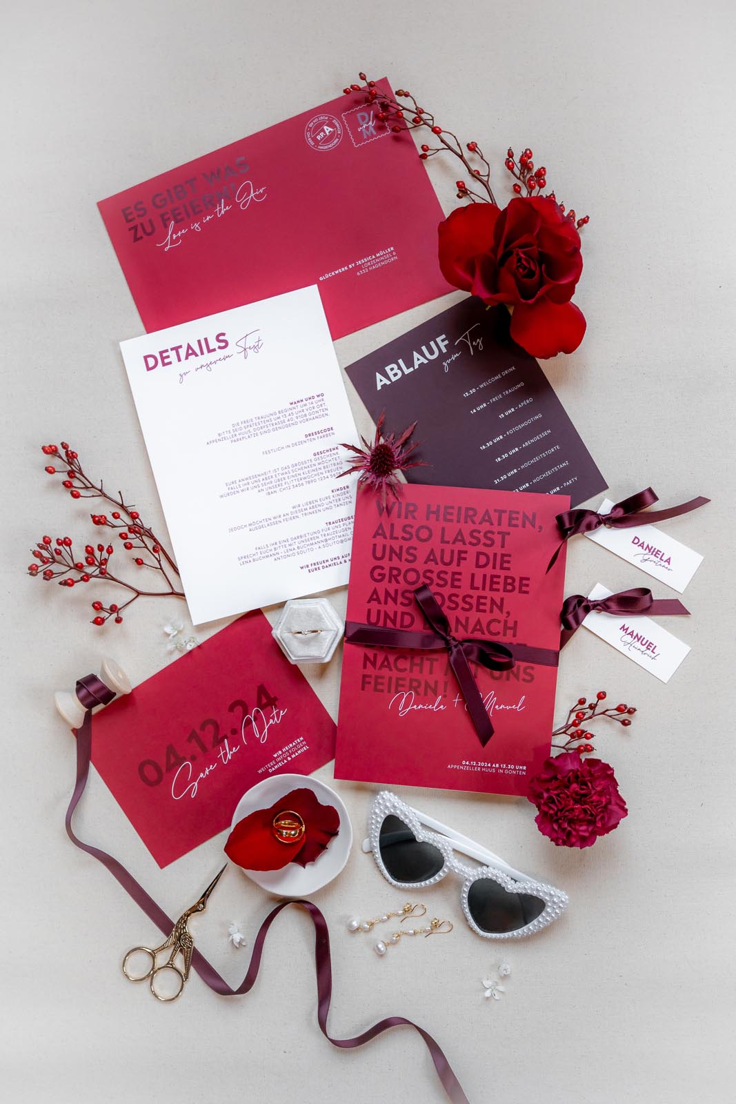 Ein wunderschönes Hochzeitsshooting in der weihnachtlichen Atmosphäre des Appenzeller Huus – Rot- und Goldtöne, Kerzenschein, Lichterketten – ein Hochzeitstraum inmitten einer verschneiten, winterlichen Atmosphäre.