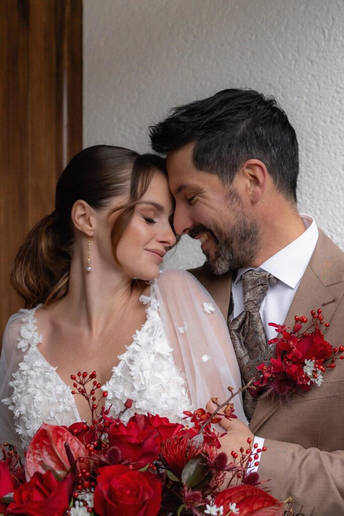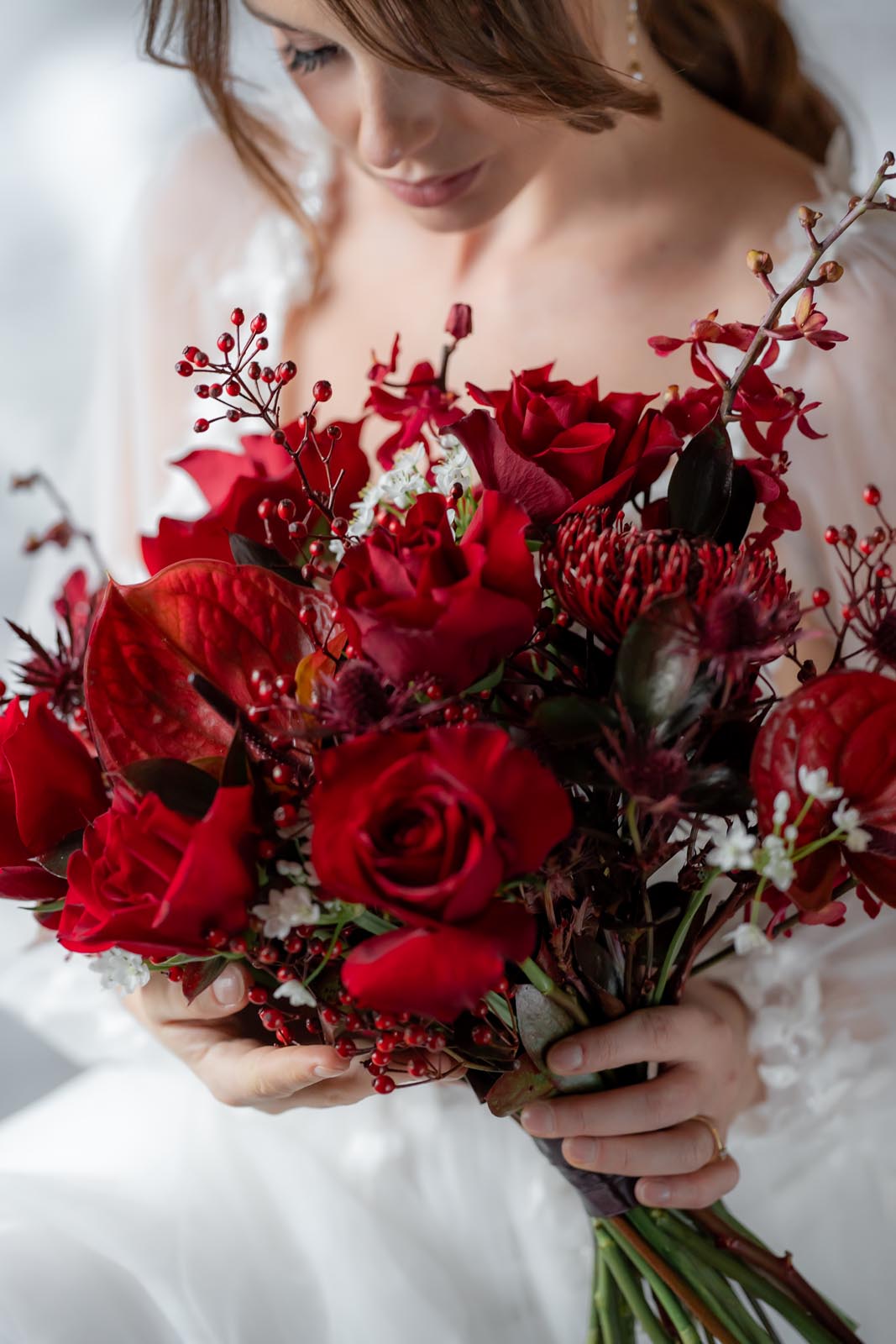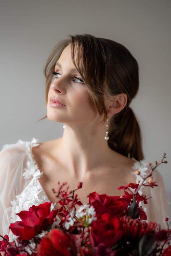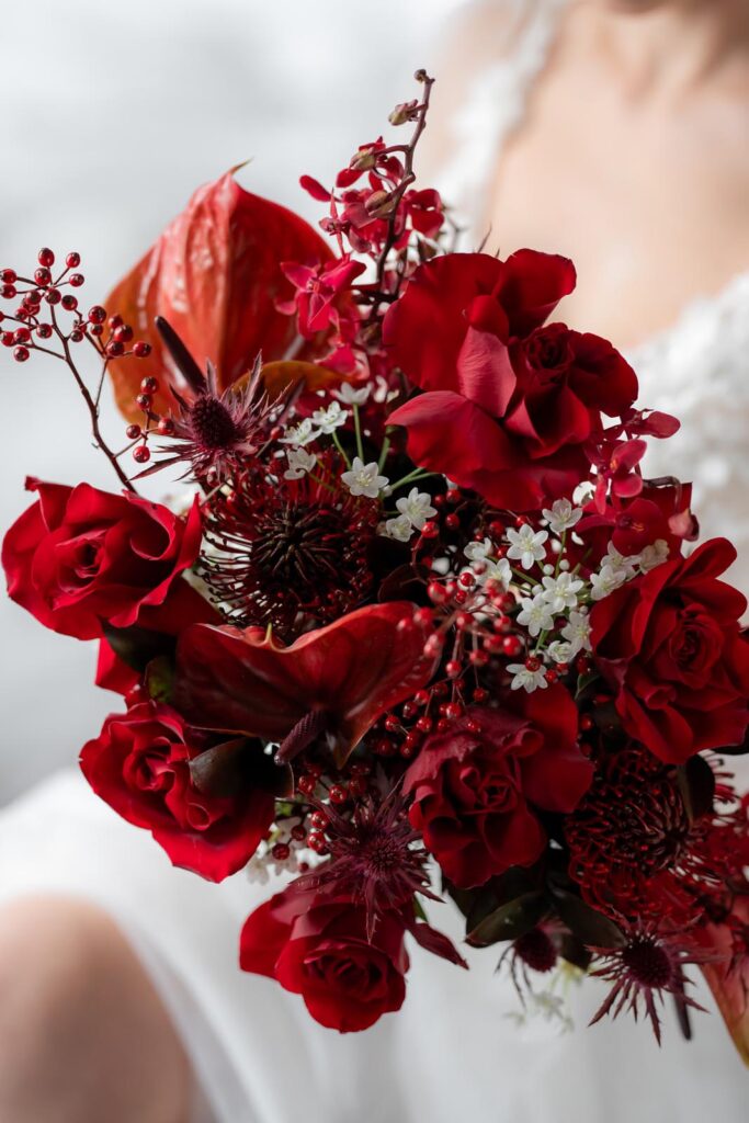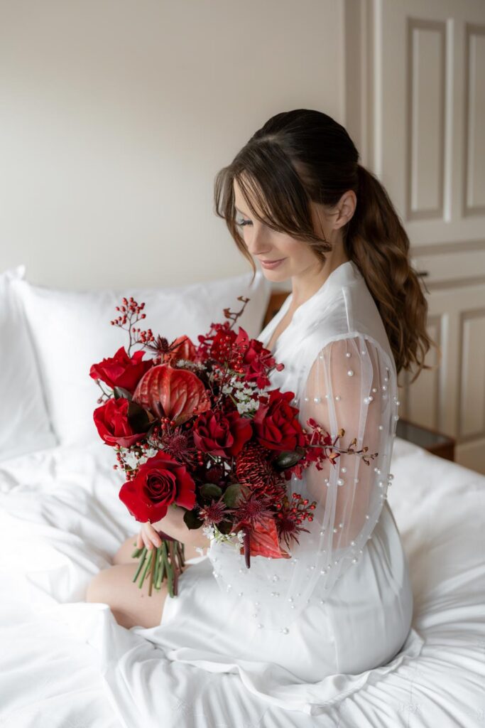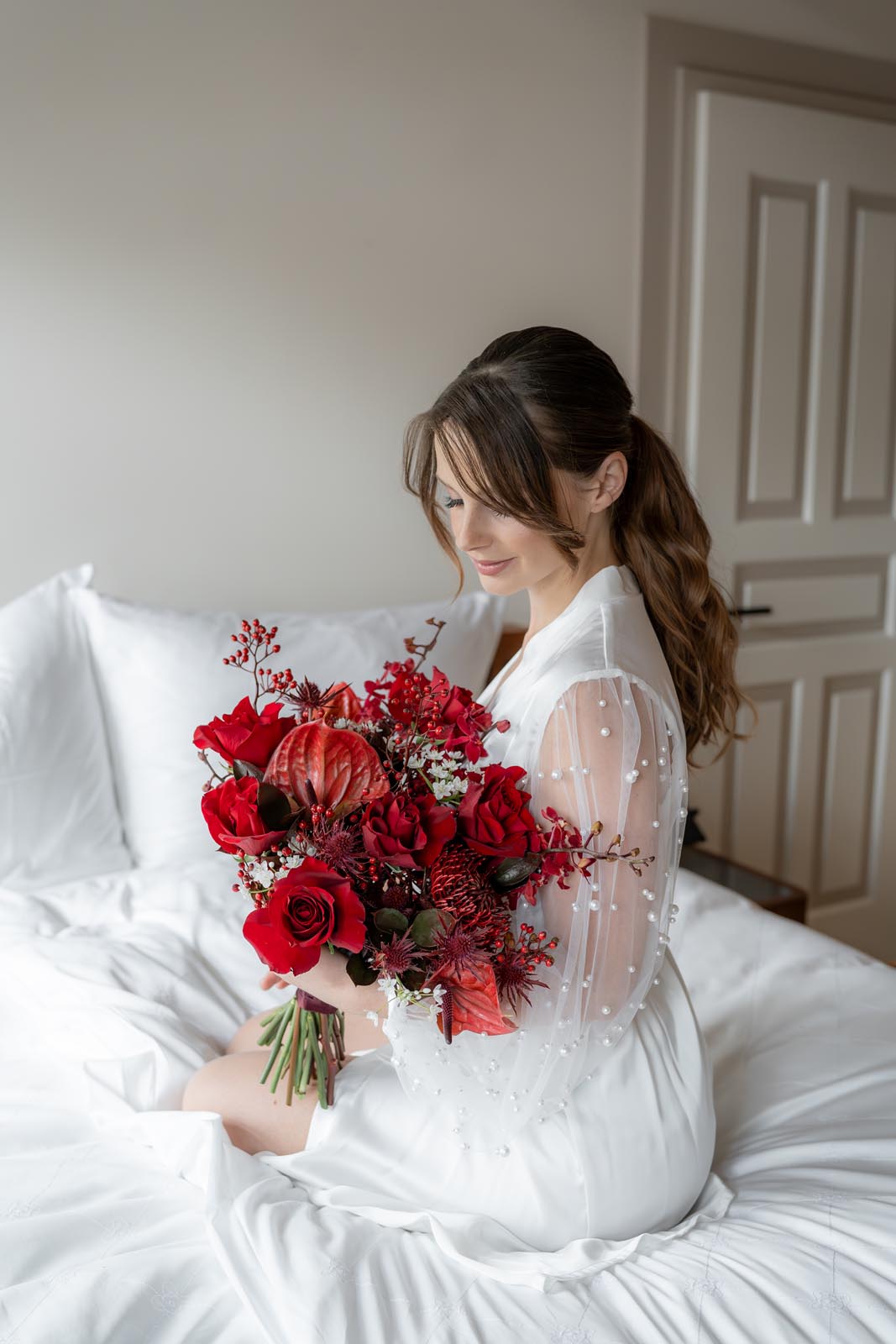 Ein wunderschönes Hochzeitsshooting in der weihnachtlichen Atmosphäre des Appenzeller Huus – Rot- und Goldtöne, Kerzenschein, Lichterketten – ein Hochzeitstraum inmitten einer verschneiten, winterlichen Atmosphäre.