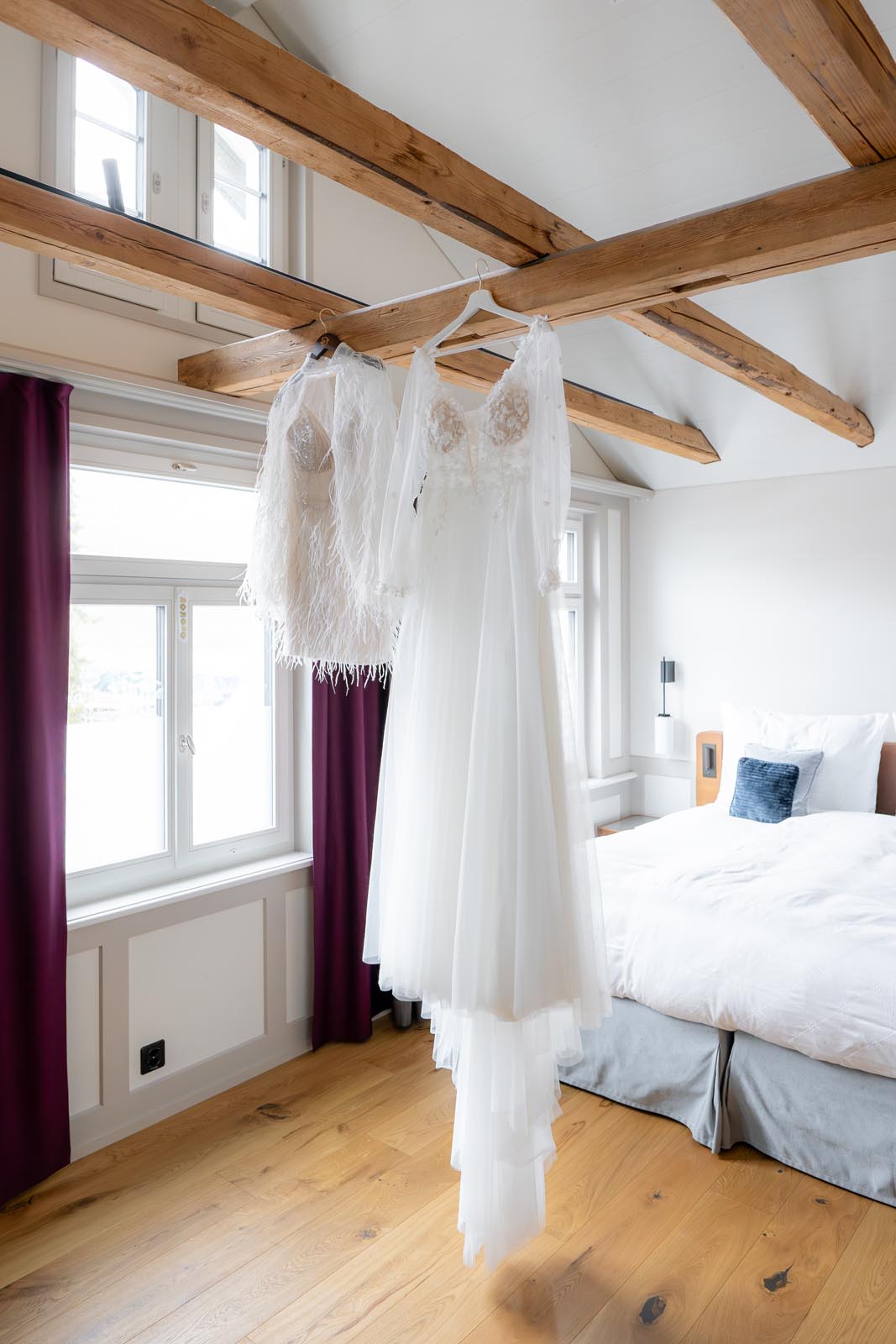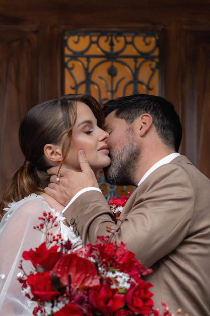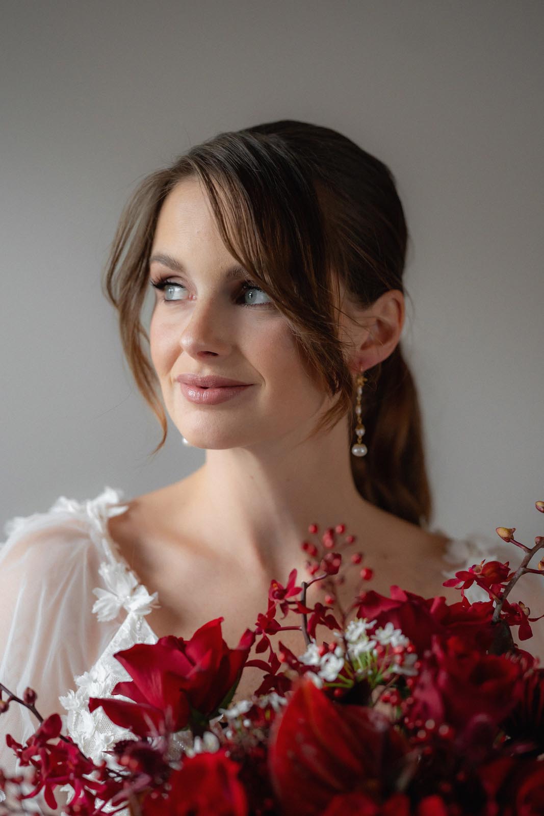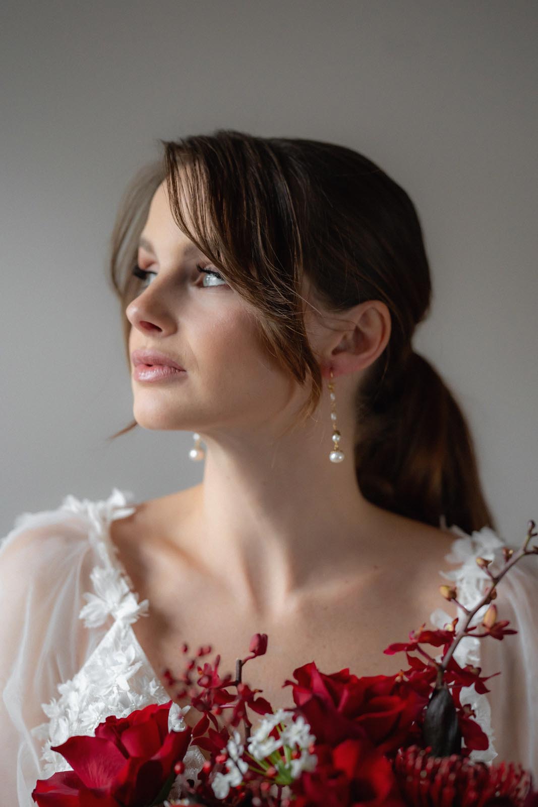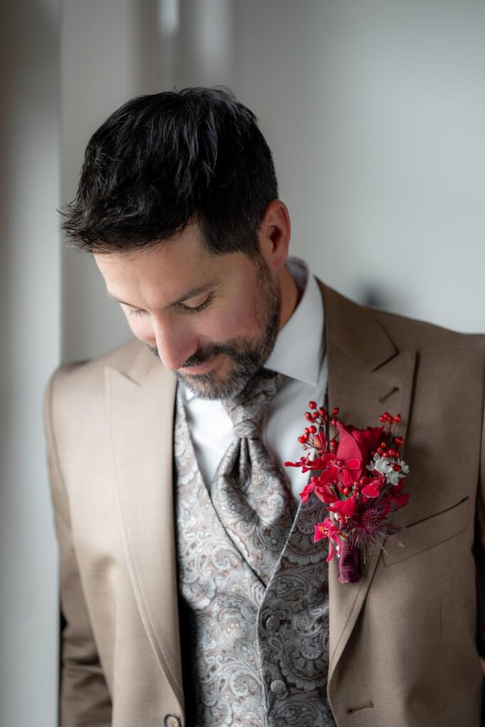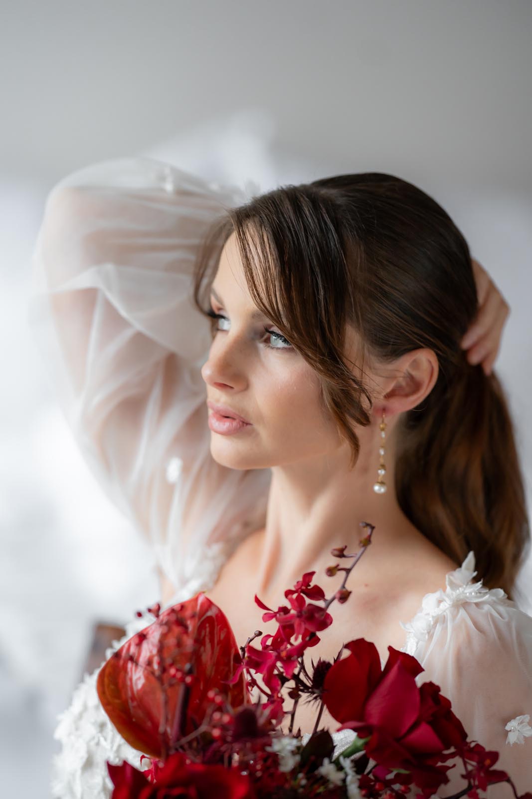 Ein wunderschönes Hochzeitsshooting in der weihnachtlichen Atmosphäre des Appenzeller Huus – Rot- und Goldtöne, Kerzenschein, Lichterketten – ein Hochzeitstraum inmitten einer verschneiten, winterlichen Atmosphäre.